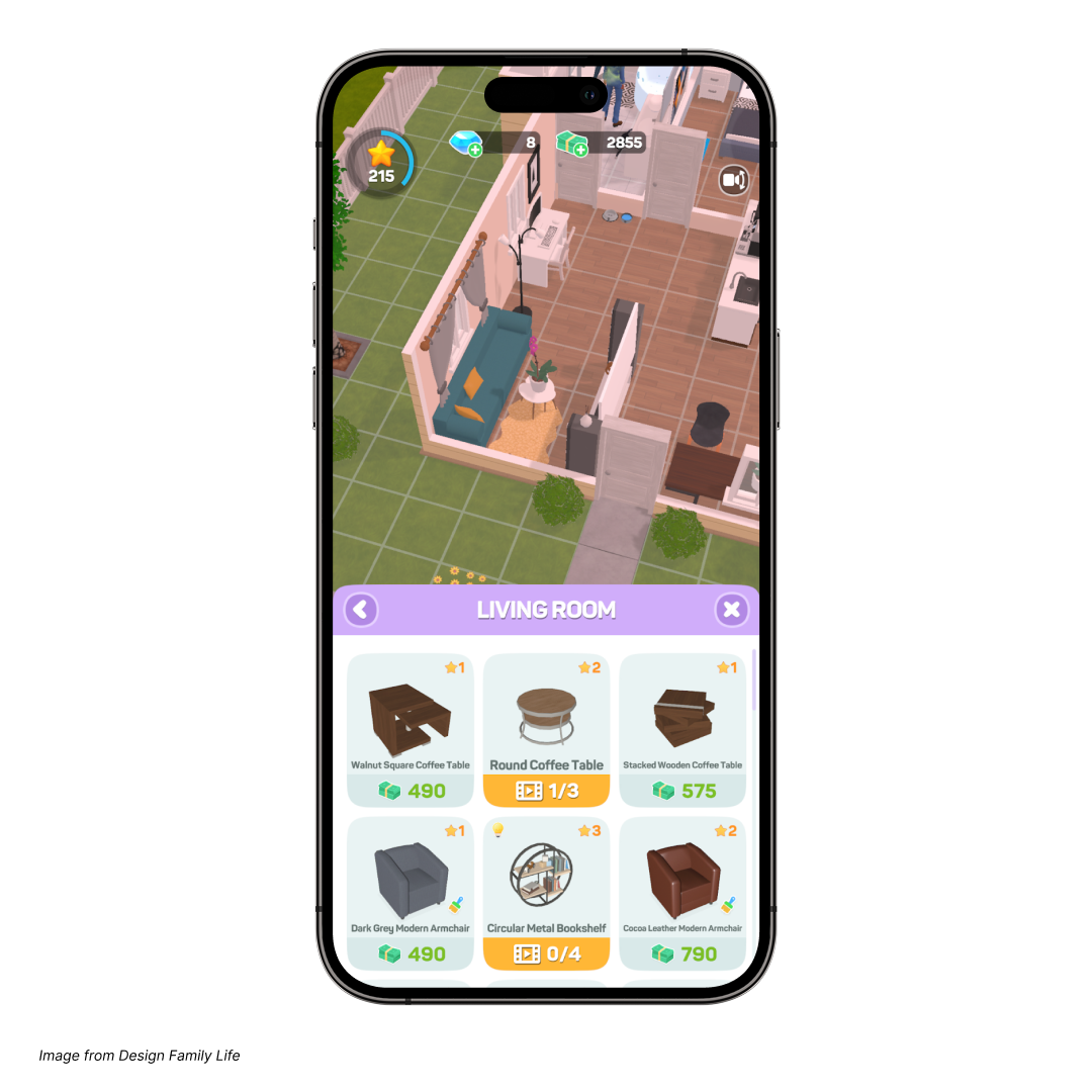 At the heart of every successful hybrid simulation game is a system of interconnected loops that work together to keep players engaged. The primary gameplay loop is your core engagement mechanic, the main action that players engage in throughout the game, whether that's making strategic decisions or designing and customizing their space. To work, the core loop must be grounded in your players’ motivations. This is usually creativity, which is driven by personalization, choice, and clear stories players can relate to. For example, in Design Family Life, players can choose everything from their character's career and partners to room styles and outfits, with interior design as the core mechanic. This allows them to select furniture, paint and wallpaper, furniture placement, and other home decor items.