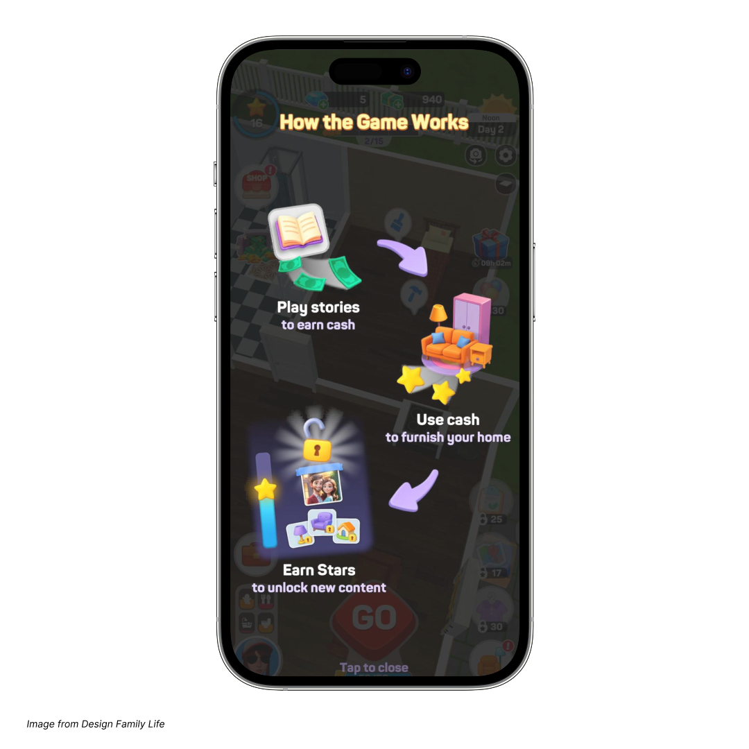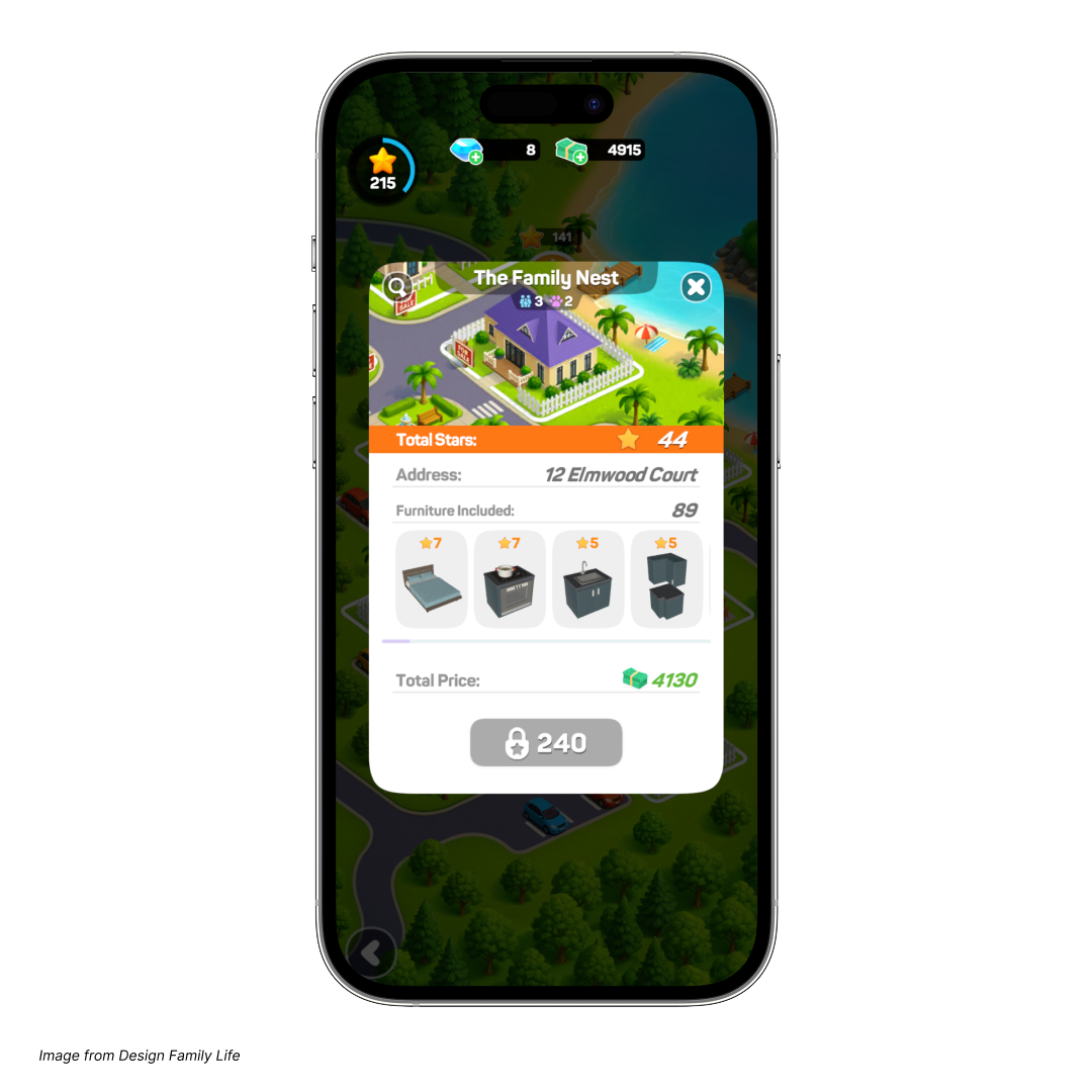 For example, in Design Family Life, players are able to unlock more stylish furniture, advanced appliances, and clothing options as they progress and earn additional stars. This keeps them steadily motivated to engage with the core gameplay. Over time, they can earn enough stars to buy a nicer house, an ambitious long-term goal that gives them an extra boost of motivation.