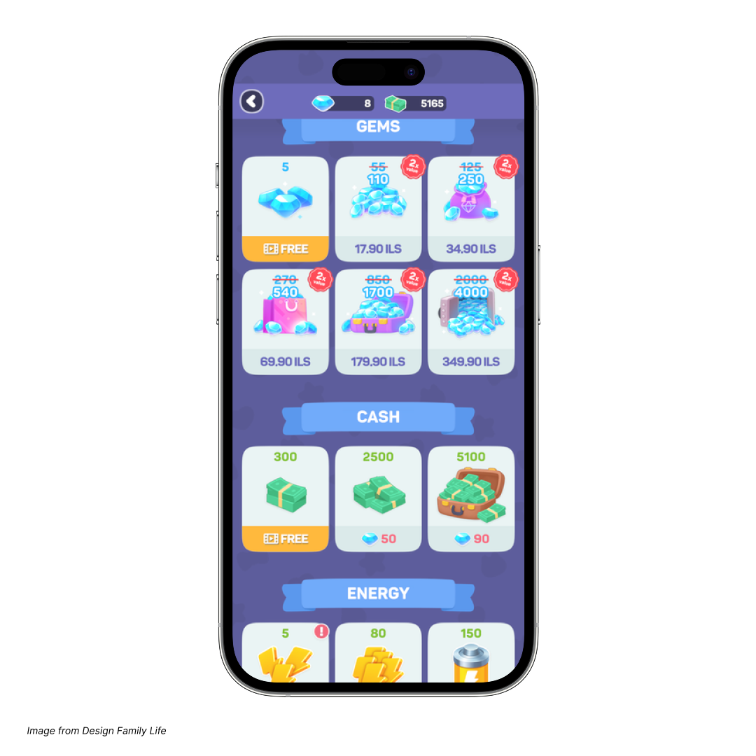 Simulation games should use multiple currency types to promote different aspects of the core loop and meta layers, but if these currencies are unbalanced or fail to work cohesively together, they can confuse players or make each one feel less valuable and harder to understand. For example, initially, Design Family Life had energy for actions, stars for story progression, cash for furniture, and coupons to skip rewarded videos. Eventually, our team realized that the coupons prevented players from purchasing gems, which would also enable them to skip rewarded videos or progress faster through the game. After removing the coupons, conversions jumped, with a nearly 3x increase in revenue from late-game purchases and a 40% uplift in ARPU on day 60 (D60), a simple change that made the game clearer for players and healthier for the business.