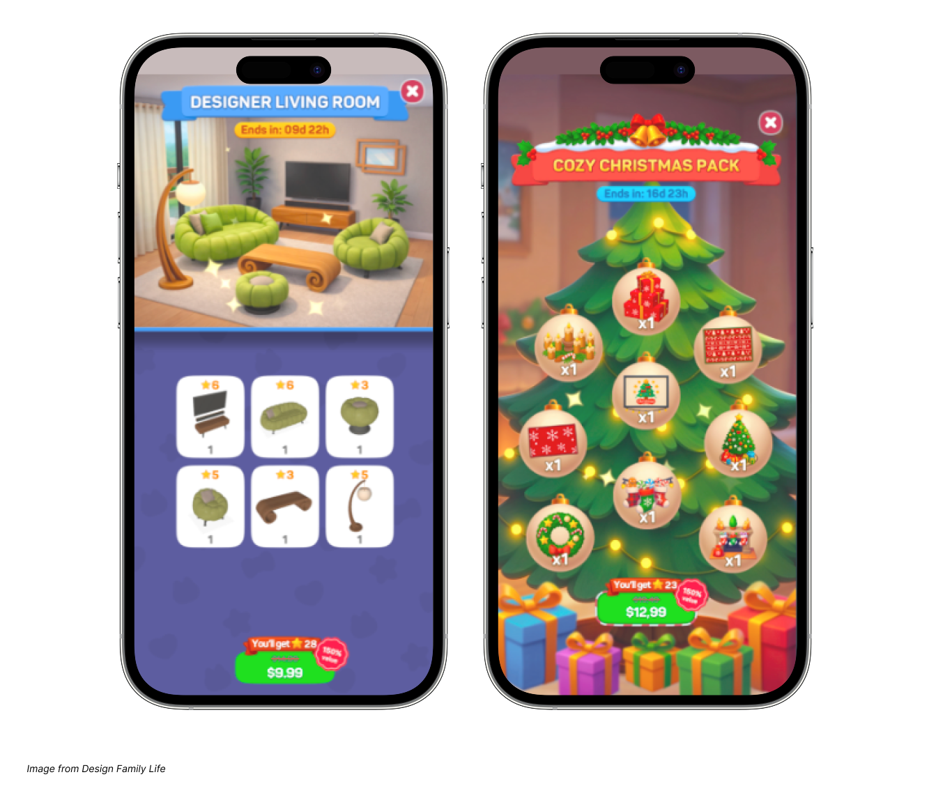 The key to success is providing LiveOps offers that appeal to specific player motivations rather than generic promotions. For example, in Design Family Life, behavioral data made it clear that the player’s prime motivation is creativity, which ties directly to the core mechanic of home decorating. They could see this because rewarded video placements players engaged with most were tied directly to furniture packs and decor themes. The team leaned into this insight by adding furniture packs as in-app purchase options, allowing players to purchase thematic and seasonal packs like Christmas-themed home decor sets, as well as bundles related to events and story moments they care about. The result of these changes was significant, leading to a 15% increase in day 7/day 14 (D7/D14) ROAS and a 50/50 IAP-IAA split, with late-game players driving most of the revenue.